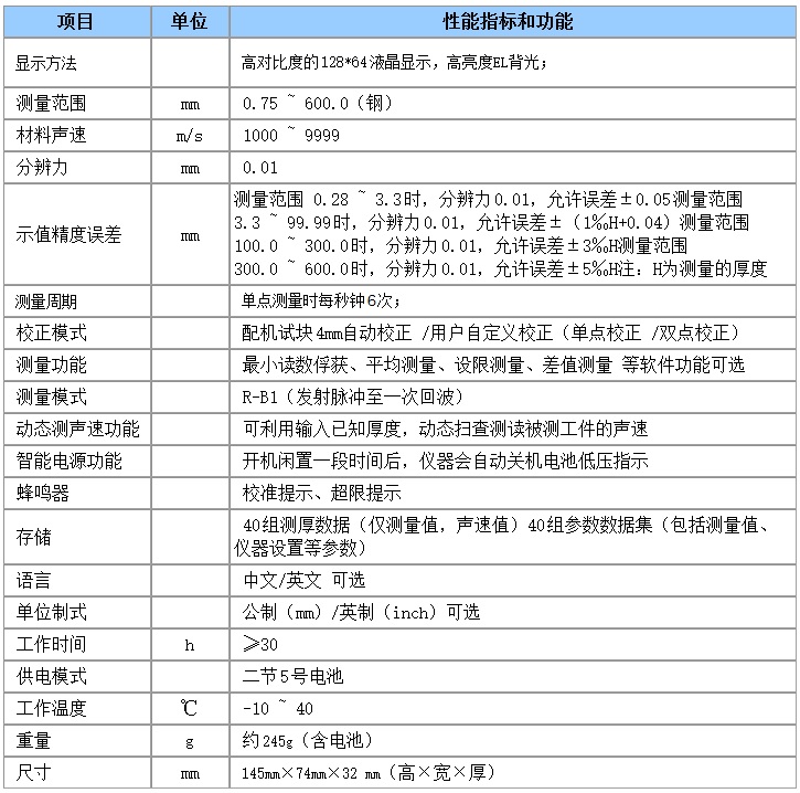 本儀器是智能型超聲波測厚儀,采用新的高性能、低功耗微處理器技術(shù),基于超聲波測量原理,可以測量金屬及其它多種材料的厚度,并可以對材料的聲速進行測量。