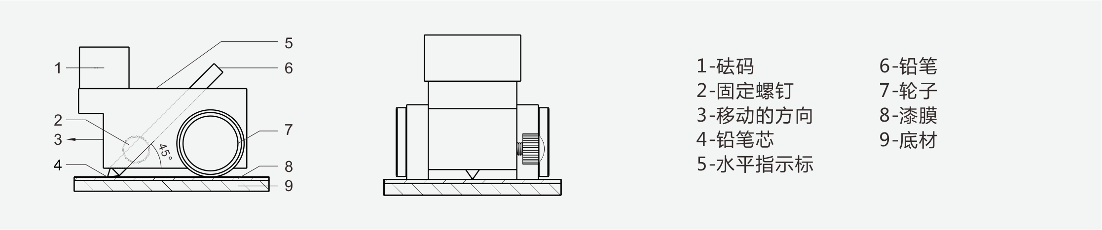 鉛筆硬度計為機械式,三點接觸被測表面(二點為輪,一點為鉛 芯)始終保證鉛筆與試驗表面成45°夾角,用手推動儀器 滑動,鉛筆就在漆膜上劃出相應軌跡來。換用不同鉛筆劃 不同痕跡,據此可判定涂膜的硬度值。