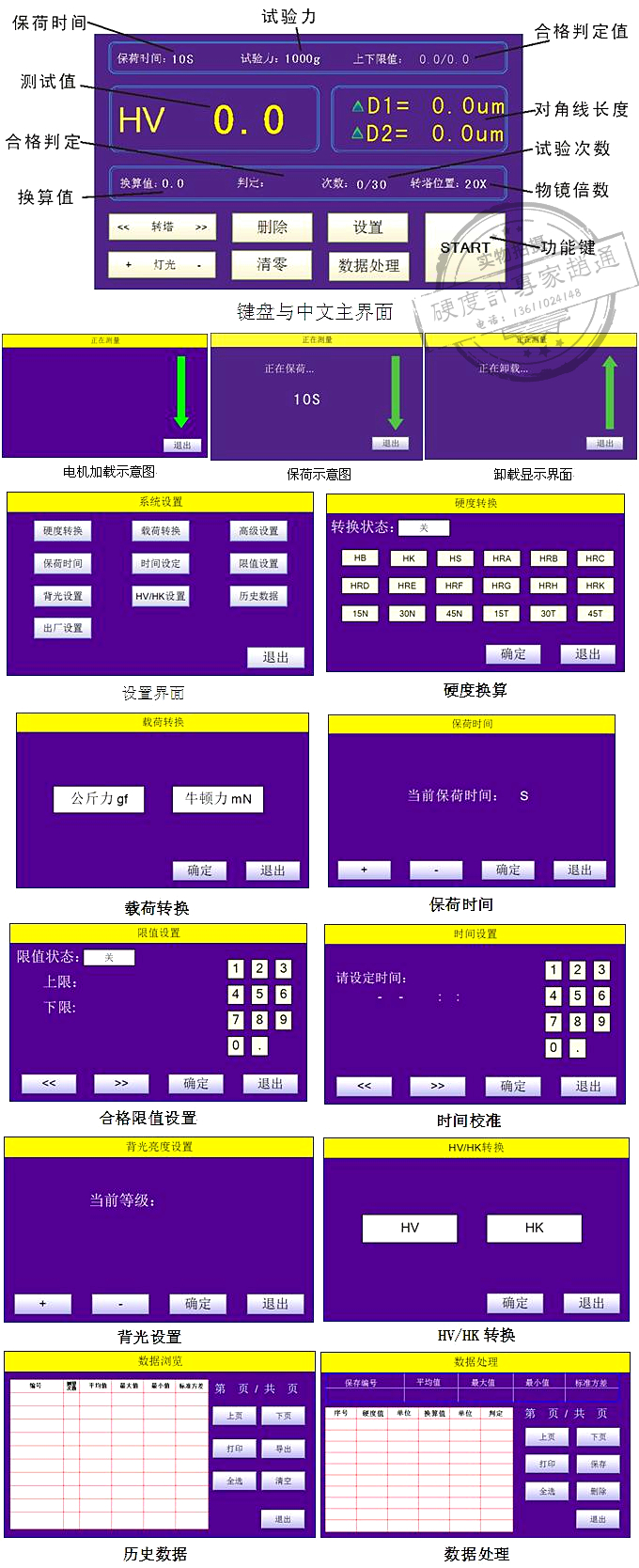 ▲ 工業大液晶屏上可直觀顯示硬度值,換算硬度,試驗方法,試驗力,保荷時間,測量次數,試驗過程直觀明了;