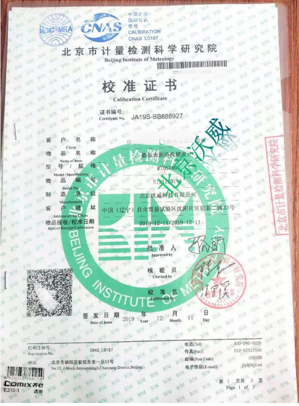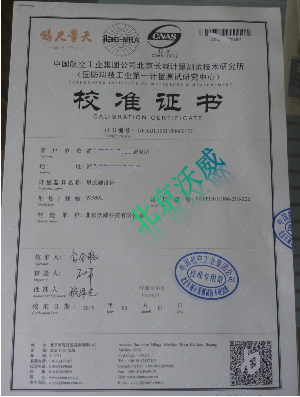 里氏硬度計(jì)計(jì)量檢定證書(shū)